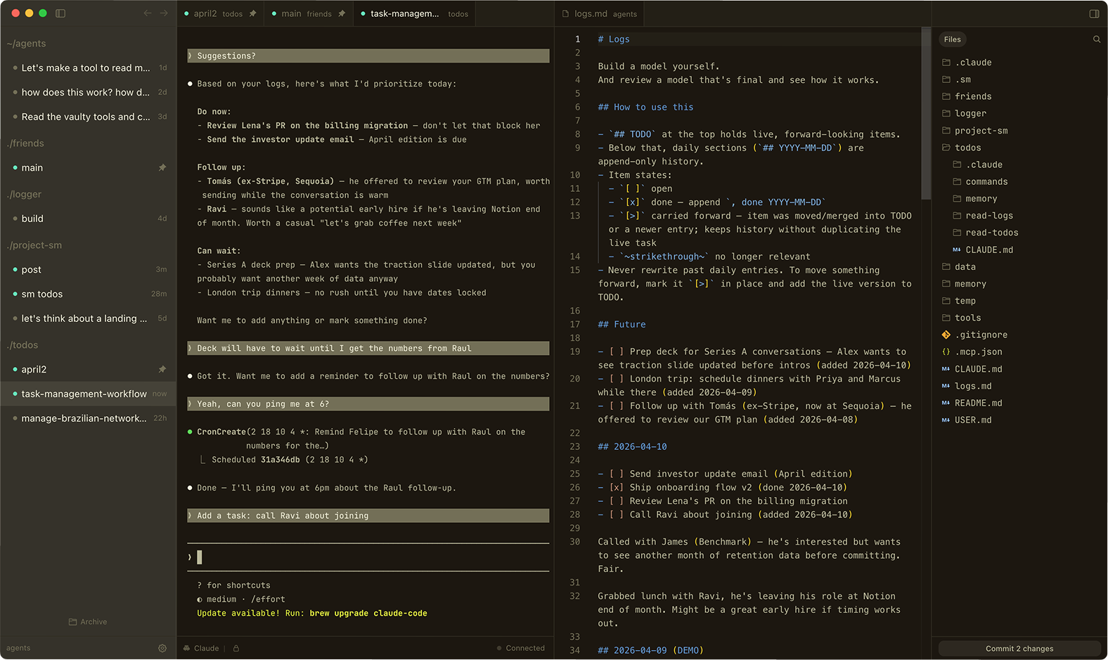 The second benefit is ergonomics. sm has tabs and splits inspired by VSCode. You can drag files and sessions around, much easier than using your terminal.